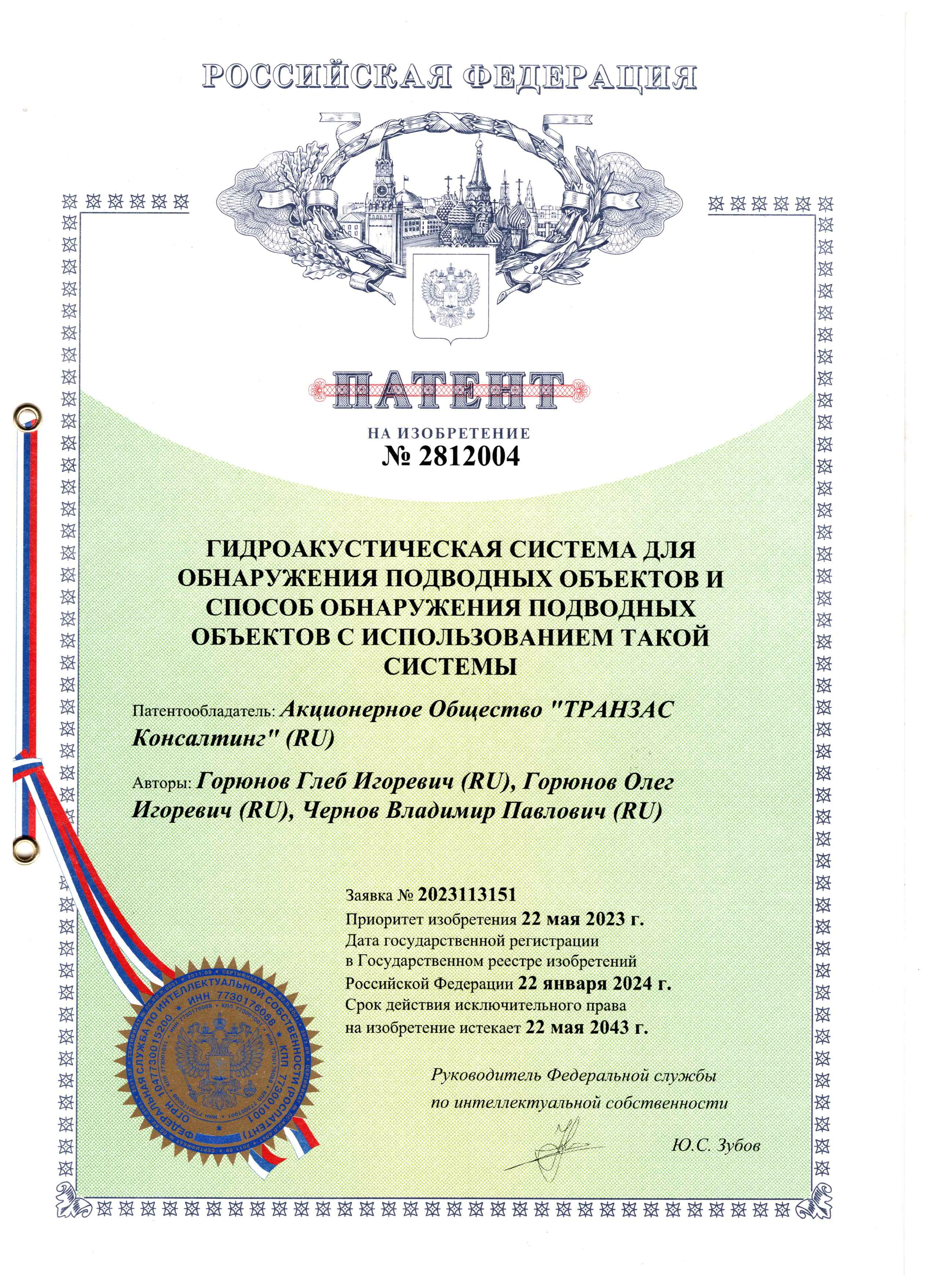 Государственный реестр изобретений Российской Федерации 22 января 2024 г. зарегистрировал патент №2812004 на изобретение АО «ТРАНЗАС Консалтинг»: «Гидроакустическая система для обнаружения подводных объектов и способ обнаружения подводных объектов с использованием такой системы».