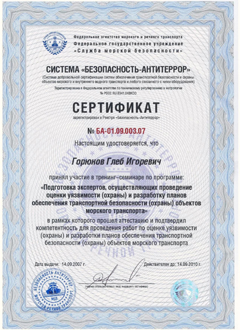 Эксперты ЗАО «Транзас Консалтинг», отвечающие за разработку планов охраны судов и портовых средств, успешно прошли подготовку и сертификацию по системе «Безопасность-Антитеррор». Первая сертификация состоялась 16-17 августа 2007 в рамках тренинг - семинара на тему: «Подготовка экспертов, осуществляющих разработку планов охраны судов», а вторая - 13-14 сентября 2007 г. на тренинг - семинаре «Подготовка экспертов, осуществляющих проведение оценки уязвимости (охраны) и разработку планов обеспечения транспортной безопасности (охраны) объектов морского транспорта».