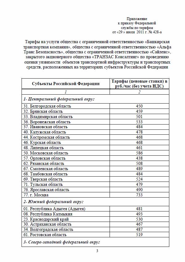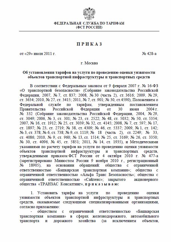 В соответствии с приказом Федеральной службы по тарифам РФ № 428-а от 29 июля 2011 г. (зарегистрирован в Минюсте России, рег. №21680 от 19.08.2011 г.) были утверждены тарифы ЗАО "ТРАНЗАС Консалтинг" на проведение оценки уязвимости объектов транспортной инфраструктуры (ОТИ) и транспортных средств (ТС).